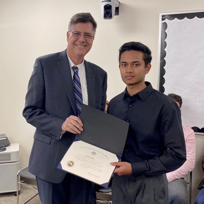 Congratulations to Stoughton High senior Anish Sinha for receiving the Massachusetts Association of School Superintendents (MASS) Certificate of Academic Excellence! Massachusetts school superintendents present this award annually to deserving students in school districts across the state. SPS Superintendent Dr. Thomas Raab presented Anish with his award during the School Committee meeting on April 12.