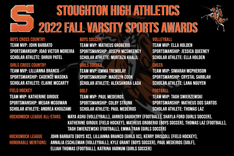 We celebrated the fall season at the Stoughton High Fall Sports Awards Night, presenting team awards for MVP, sportsmanship, and scholar athlete, as well as recognizing our Hockomock League All-Stars and Honorable Mentions. Congratulations to all of the student award winners! Photos from the Fall Sports Awards Night can be found here and here.