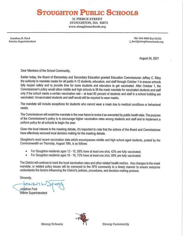 Stoughton's most recent vaccination data which encompasses middle and high school aged students, posted by the Commonwealth on Thursday, August 19th, is as follows: