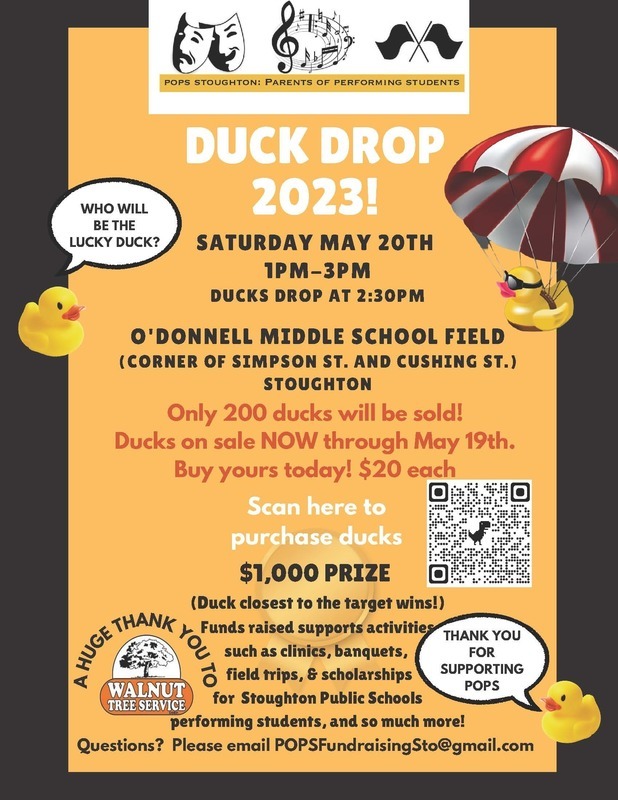 POPS is having a Duck Drop on May 20, 2023 at the O'Donnell Middle School Field from 1 PM to 3 PM.